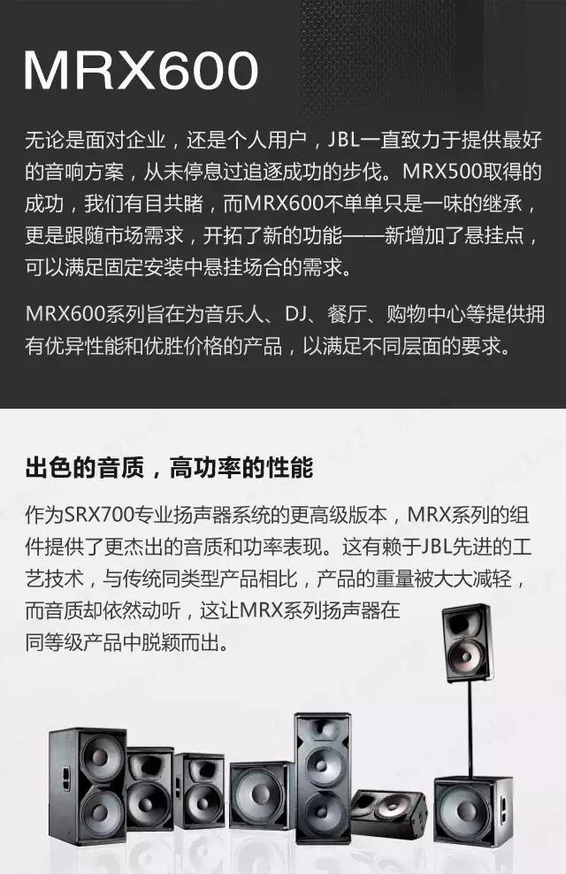 JBL MRX600系列專業(yè)音響旨在為音樂人、DJ、餐廳、購(gòu)物中心等提供擁有優(yōu)異性能和優(yōu)勝價(jià)格的產(chǎn)品,以滿足不同層面的要求。