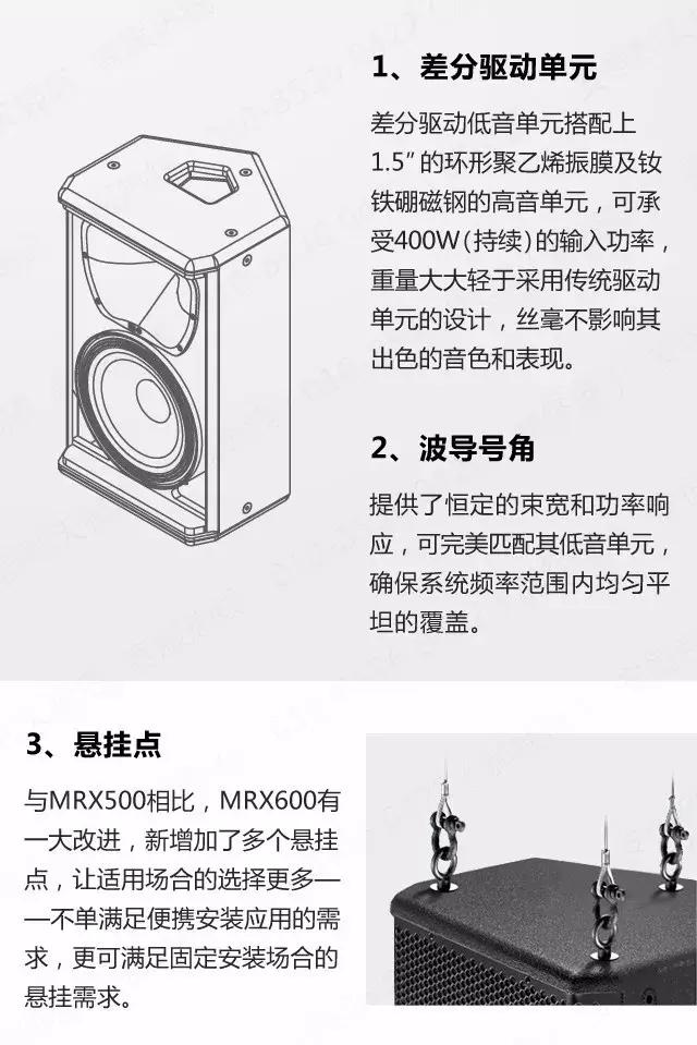 無論是面對(duì)企業(yè),還是個(gè)人用戶,JBL一直致力于提供最好的音響方案,從未停息過追逐成功的步伐。MRX500取得的成功,我們有目共睹,而MRX600不單單只是一味的繼承,更是跟隨市場(chǎng)需求,開拓了新的功能------新增加了懸掛點(diǎn),可以滿足固定安裝中懸掛場(chǎng)合的需求。