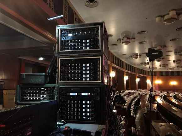 雖然如此,本著盡善盡美的原則,工程師們還在舞臺上架設的天線方面做了周密的布置。一組天線架設于觀眾席后方調音臺區域,另外一組天線架設在舞臺上,由于舞臺距接收機距離較遠,并且現場對鋪設線纜要求極高,所以舞臺上天線采取光纖回傳射頻信號方案(RFoF)。