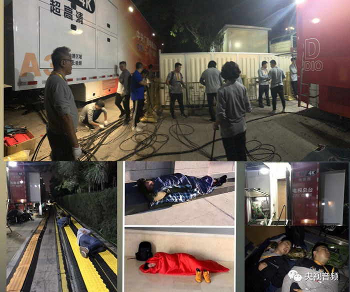 此次活動(dòng)覆蓋區(qū)域極大,由于各系統(tǒng)分區(qū)工作,系統(tǒng)間的線纜級(jí)聯(lián)需要鋪設(shè)大量纜線近30公里。其中使用8根700米長(zhǎng)的光纜(普通光纜每根200米),與現(xiàn)場(chǎng)信號(hào)中心進(jìn)行級(jí)聯(lián)。由于排練期間長(zhǎng)安街相關(guān)區(qū)域并未封閉管理,每次排練都需要重新鋪設(shè),加之工作時(shí)間和人員數(shù)量的限制,每天重新鋪放8條700米光纜的工作強(qiáng)度非常大,恨不得將其一刀兩斷(所有直播結(jié)束后,在系統(tǒng)拆除的時(shí)候錄音師們真的做到了)。有的系統(tǒng)地處核心位置,管控嚴(yán)密,進(jìn)出不便,逢周末閱兵活動(dòng)和聯(lián)歡晚會(huì)兩天演練,錄音師需提前上崗,演練期間不能撤離,結(jié)束撤下來(lái)時(shí)已經(jīng)是36小時(shí)以后。國(guó)慶大典直播當(dāng)天,為了趕在布放聯(lián)歡晚會(huì)設(shè)施的重型機(jī)械進(jìn)場(chǎng)之前完成轉(zhuǎn)播設(shè)備撤場(chǎng),需要在閱兵結(jié)束后40分鐘之內(nèi),收完總長(zhǎng)幾十公里的線纜,這幾乎是不可能完成的任務(wù),兩個(gè)轉(zhuǎn)播系統(tǒng)的所有人員在閱兵直播信號(hào)切走的一瞬間撲向廣場(chǎng)。