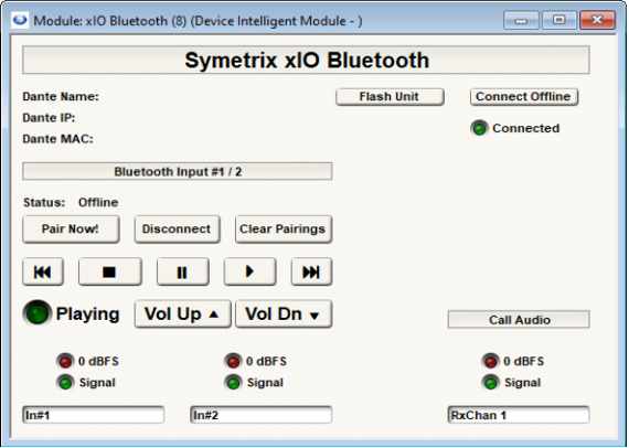 xIO Bluetooth經過配置后可限定為媒體連接使用,也可設置為手機橋接連接,或同時支持媒體與手機連接。xIO Bluetooth控制的所有特性都可以通過Symetrix遙控設備、SymVue面板,或第三方控制系統得到控制。