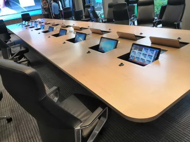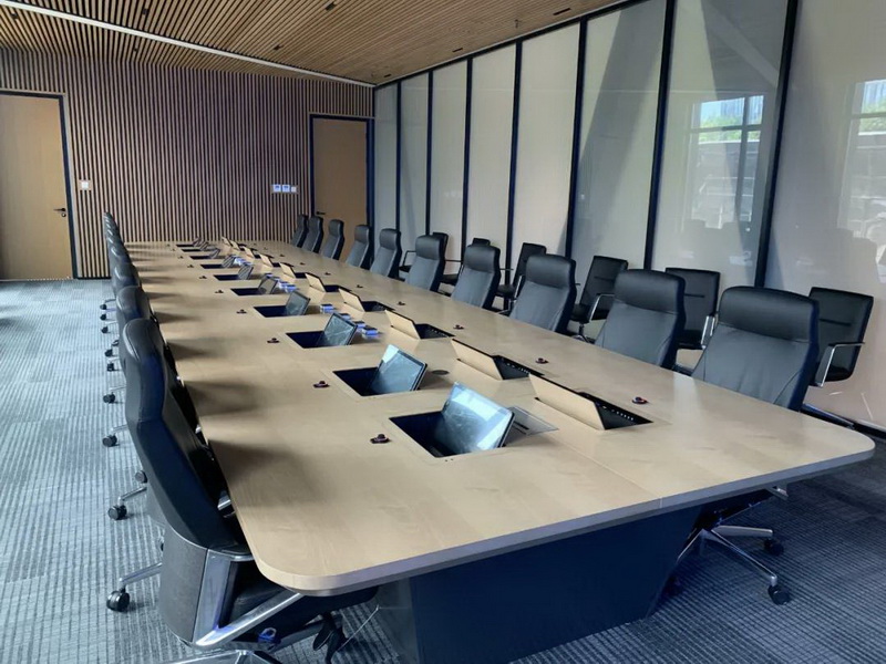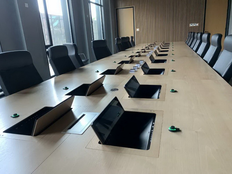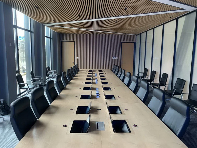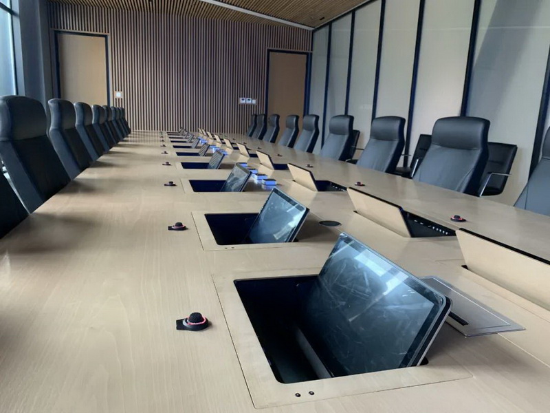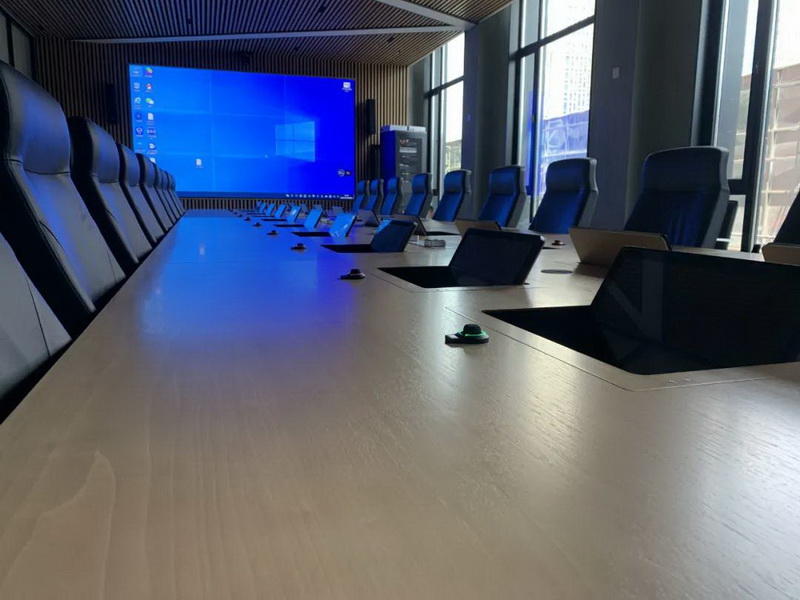 2、會(huì)議桌有升降式觸摸屏,既要配合好無(wú)紙化,話筒拾音必須達(dá)到最佳效果,無(wú)雜音。