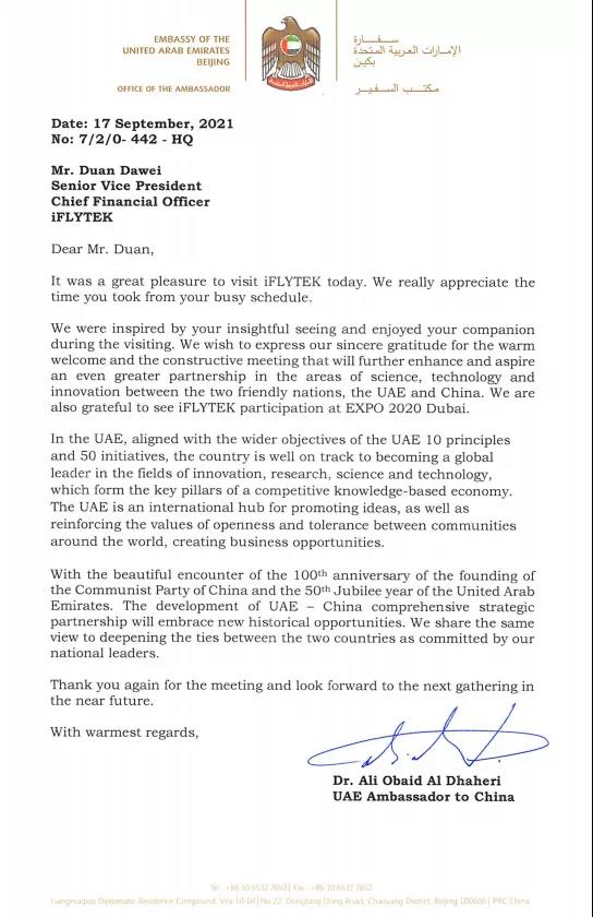 阿聯酋駐華大使Ali Al Dhaheri、經濟參贊Saleh Alhemeiri、經濟研究員Bashir Modanov等一行專程來科大訊飛北京研發中心參觀交流,體驗了訊飛數字多語種播報、訊飛聽見多國語言實時轉寫、以及在多領域的前沿技術和產品。Ali Al Dhaheri大使表示非常期待并歡迎訊飛產品參加迪拜世博會。
